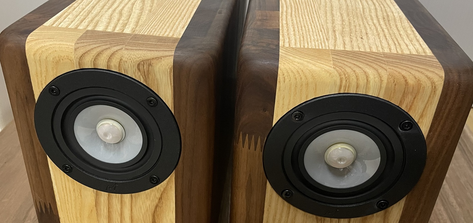 JuveAcoustics史上、最強強度のキャビネットになります。内容積を確保するために板厚の妥協を一切しておりません。外形寸法比で37パーセントしか内容積がありません。まさに木の塊です。